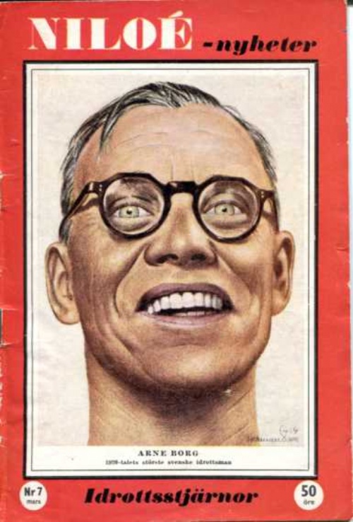 Häfte niloe-nyheter 1953 idrottsstjärnor no.7 1920-talets största svenska idrottsman. Niloé-nyheter. Under åren 1921-29 satte Borg inte mindre än 32 världsrekord. OS guld 1924,1928, samt silver, brons vid samma Olympiader.