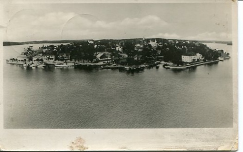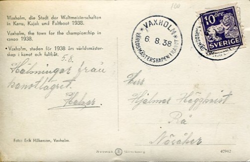 Vykort frankerat, med tillskrift 1938. Bild över Vaxholm sv/v. Text: Waxholm, staden för 1938 års världsmästerskap i kanot och faltbåt- även på engelska och tyska. FRI FRAKT-FREE DELIVERY!