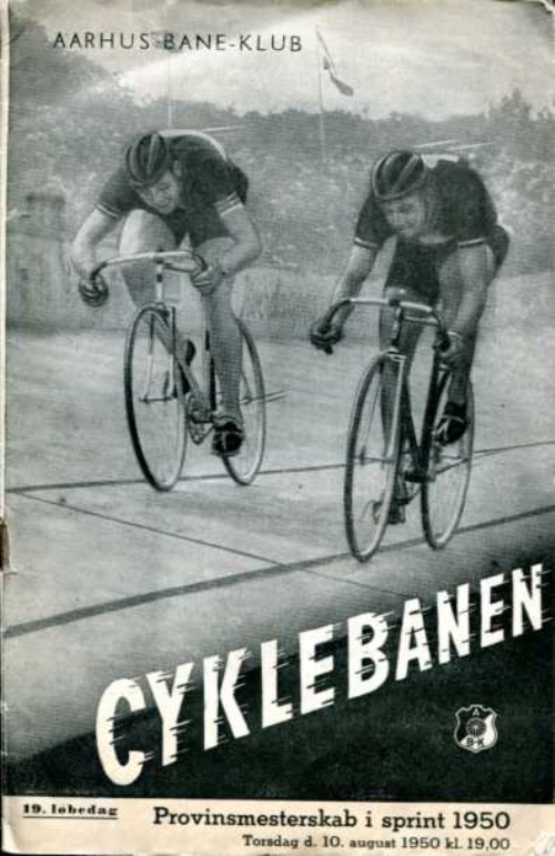 Program klammerhäftad Aarhus bane-klub 1950. Provinsmesterskab i sprint 10/8 1950. Inskrivet resultat.
