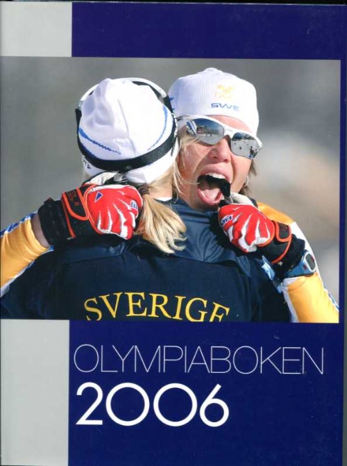 Skinnimitationsband/skyddsomslag med rygg och främre pärm dekorerad i guld Strömbergs / Brunnhages 2006. illustrerad i färg. Officiell redogörelse i samråd med Sveriges olympiska kommitté.