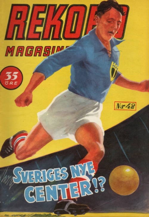 Lagbild: Norska landslaget B i fotboll mot Sverige B i Karlstad 19/9 1948. Baksida Gunnar Nilsson Redbergslids BK. "Sveriges nye center!?"