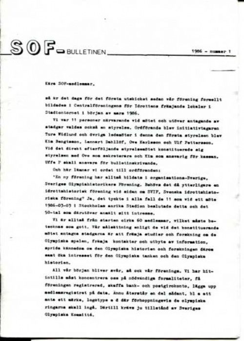 Klammerhäfte SOF-bulletinen no.1 1986. Sveriges Olympiahistorikers Förening första nummer, med protokoll fört vid konstituerade möte 3/3 1986. FRI FRAKT-FREE DELIVERY!