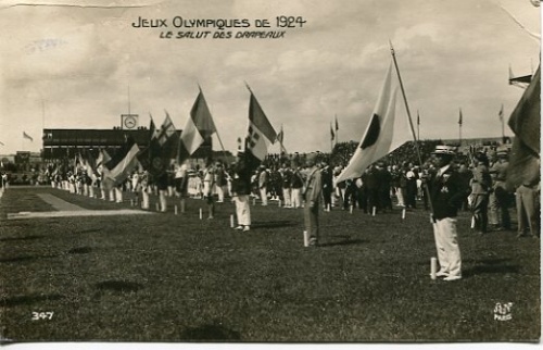 Vykort/Postcard black/white Olympic games Paris 1924 no. 347. Le salut des drapeaux, Bild: Deltagar länderna hälsar flaggan. (Participer drapeau salue pays). Stamp/stämpat Sweden. FRI FRAKT-FREE DELIVERY!