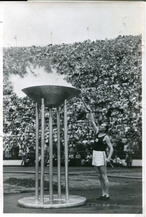 Brevkort postfriskt Olympiad Helsinki 1952. Sv/v No.301 Olympiaelden tänds/The olympic light av Paavo Nurmi Finland.