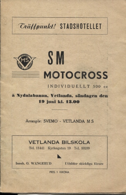 Program SM motocross Vetlanda 19/6 1960 individuellt 500 cc inskivet resultat