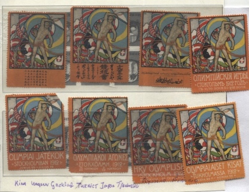 Brevmärke/Vignette Hjortzberg Olympic publicity poster stamps with texts in different languages inc. the rare Japanese, Chinese (17.300) & Arabic versions issued in very limited numbers. Russia, Finland,Japan ,Greek HRY (Hungaria Skada hörn)