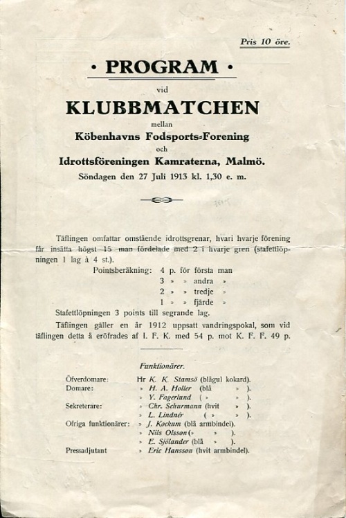 Programhäfte klubbmatchen mellan Köpenhamns Fotsportsförening och Idrottsföreningen Kamraterna Malmö 27/7 1913.inskrivet resultat. FRI FRAKT-FREE DELIVERY!