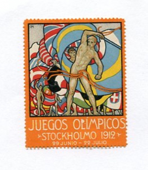 Brevmärke/Vignette 4,5 x 6 cm Färg/colour with rubb/gummering Text: Juegos Olimpicos Stockholmo 1912.Artis: Olle Hjortzberg, Spansk/Spanish upplaga 100300.