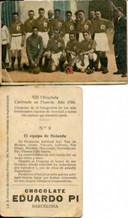 färgkort/colourcard Chocolate Barcelona 1924, VIII Olympiada Francia Hollandslandslag/ El equipo de Holanda no. 8. Olympiada Francia Holland National Team, lite nött. frakt fritt