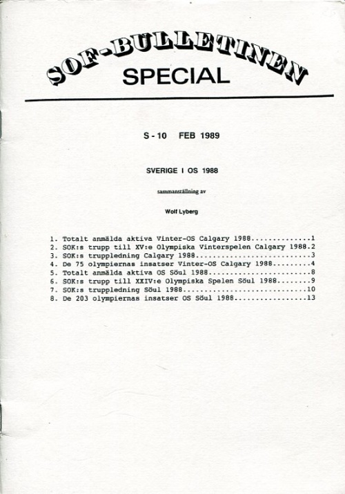 Häfte S.O.F-bulletin no. 10. Sverige i OS 1988 Vinterspelen Calgary samt sommarspelen Söul.